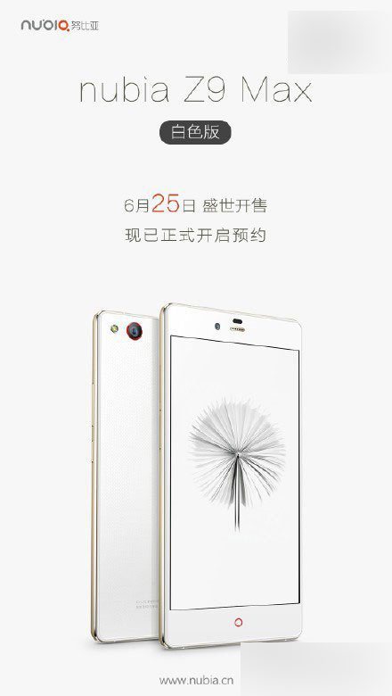 nubia Z9 Max白金诱惑来袭,将于6月25日正式预约,售价2499元,这款白色版nubia Z9 Max现在已经在努比亚官网、京东商城开启预约。