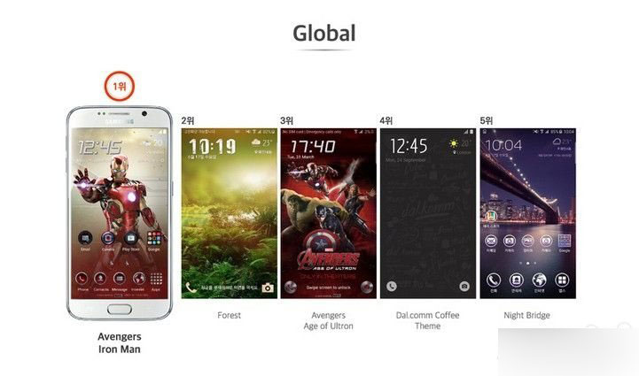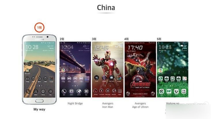 据悉,在全球范围内最受欢迎的主题为《复仇者联盟》系列中的“钢铁侠”,实际上这款主题的下载量也排在了多数地区的前五名以内,比如韩国、美国、英国、印度等,当然也包括中国。而国内用户最喜欢的主题前五名有三款为风景类样式,其中排在第一的是“My Way”。