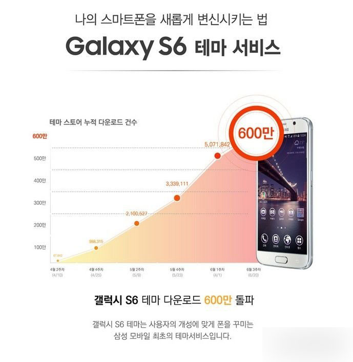 今天三星官方宣布,Galaxy S6 和 Galaxy S6 edge 主题的累计下载量已经超过 600 万次,这是自 4 月 10 日全球上市以来所取得的成绩,可惜三星并未公布目前所存在的主题总数。