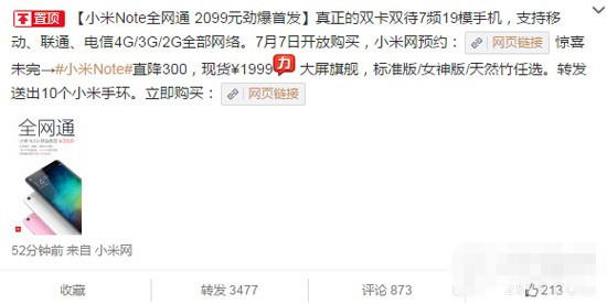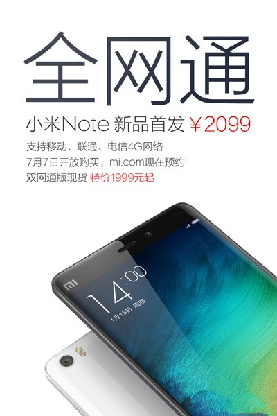 售价方面,小米Note全网通版定价2099元,目前已经在小米官网展开了预约,将于7月7日正式开卖。