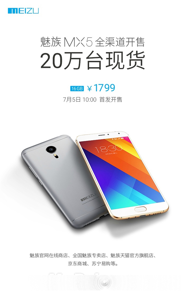 本次魅族公布,MX5开卖是在多个渠道发售,这样的话20万台就显得太微不足道了,也就是说,魅族官网在线商店、全国1800家魅族专卖店、魅族天猫官方旗舰店、京东商城、苏宁易购等同步开卖MX5。
