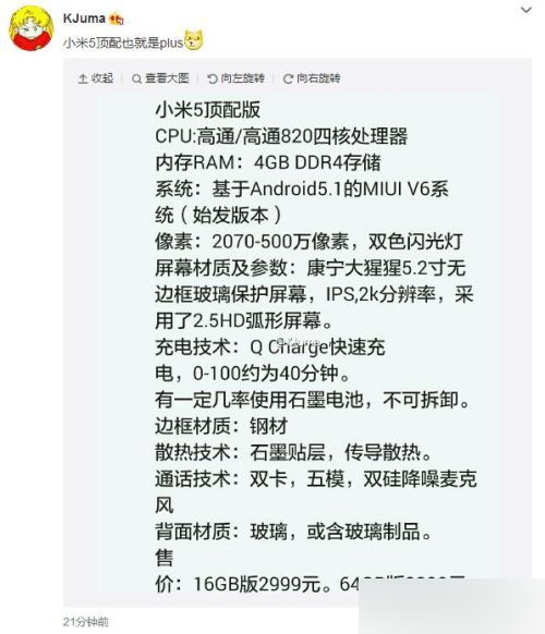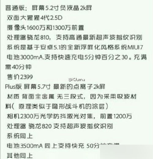 微博网友@KJuma今天曝光了一份小米5/5 Plus的手机配置信息,从这份配置上我们可以看到,小米5将搭载5.2英寸负液晶2K屏,双面大猩猩2.5D玻璃;搭载高通骁龙810处理器,后置1600万像素/前置1300万像素摄像头;电池容量为3000mAh,支持快速充电,运行安卓5.1系统,售价2399元。