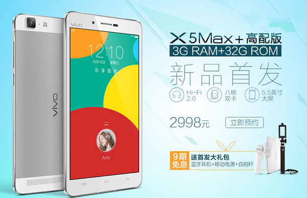 7月13日,vivo X5 Max+高配版新品在vivo天猫官方旗舰店(点此访问)首发上市,售价2998元,赠送价值600元的蓝牙耳机(169元)、移动电源(358元)以及自拍杆(89元)首发礼包;同时提供30天无忧退换货、半年延保服务。此外,另有10元优惠券可领取。下面就一起来看看了解一下吧,并附有活动地址,大家可以详情参考一下吧!