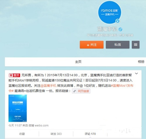 蓝魔将携手比亚迪发布手机的话题,近几个月一直传得沸沸扬扬,最近蓝魔手机微博也频频发布预告海报。蓝魔手机官方微博发布“无所畏,有所为——2015蓝魔手机新品发布会”主题海报,宣告7月13日将正式发布蓝魔手机Mos1。同时蓝魔发布招募令,该发布会还将邀请150位粉丝前往发布会现场共同见证蓝魔手机诞生。今天也就是7月13日,蓝魔手机发布了,下面来看看蓝魔手机新品发布会直播地址吧