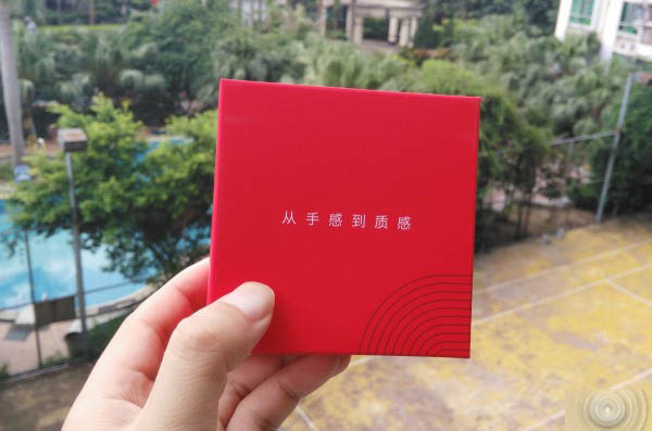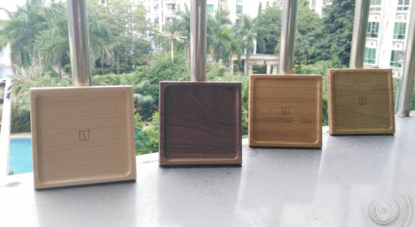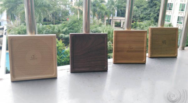 其中红色盒子打开后,里面有四个原木方块,其中三块是不同材质的木板,一块是竹板,尺寸都是88x88毫米。每一个方块正面中间都是一加LOGO,外部是13圈圆形装饰纹。背面雕刻有文字,从左到右组合,依次是:正、大、光、明四个字。之前一加手机有推出了定制版的竹纹背壳,此次一加手机2会不会继续丰富这一搭配,增加多个定制版本,目前还不知晓。