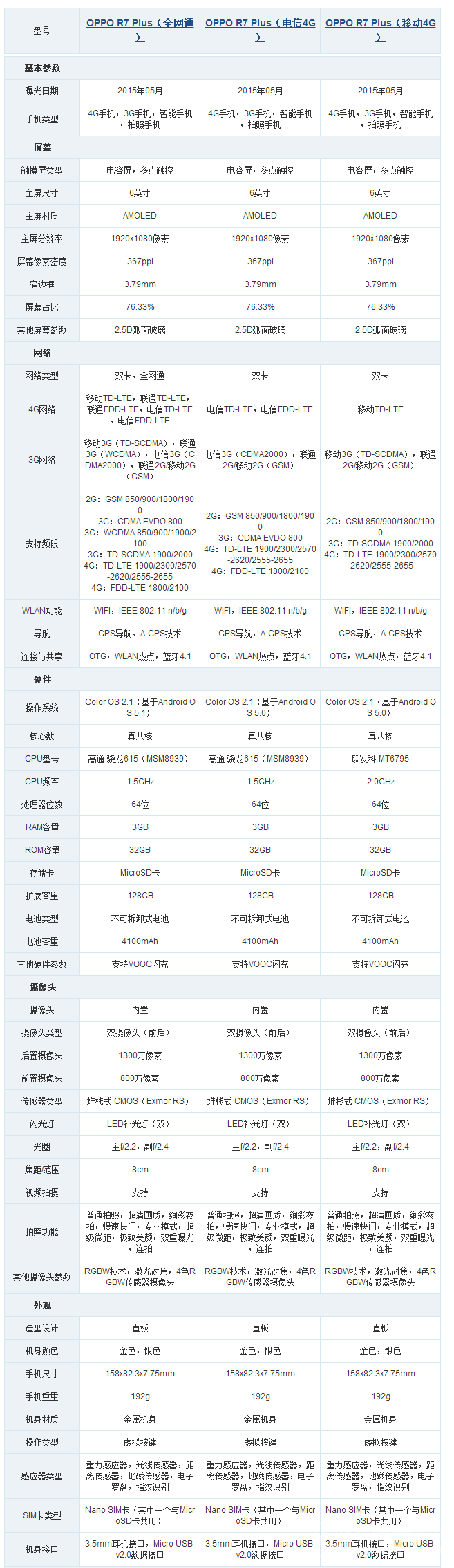 OPPO R7 Plus全网通、电信版和移动版详细对比图
