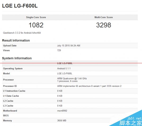 今年3月从知名Android社区XDA传来消息,LG计划将于年内推出G4的衍生机型G4 Note,以便于进一步增强和三星Galaxy Note系列的对抗实力。今天该机终于亮相跑分库,从GeekBeanch所提供的数据来看该机型号为“LG-F600L”,运行Android 5.1.1系统,1.44GHz的高通骁龙808处理器,4GB的内存。