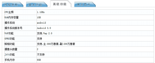 这款手机搭载了一枚1.1GHz主频的高通骁龙210四核心A7架构处理器,内建1GB内存,8GB存储空间,搭载Android 5.0操作系统。800万+200万的像素组合。电池容量为2200mAh。