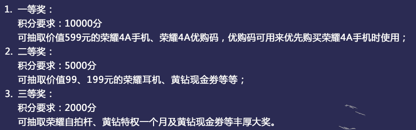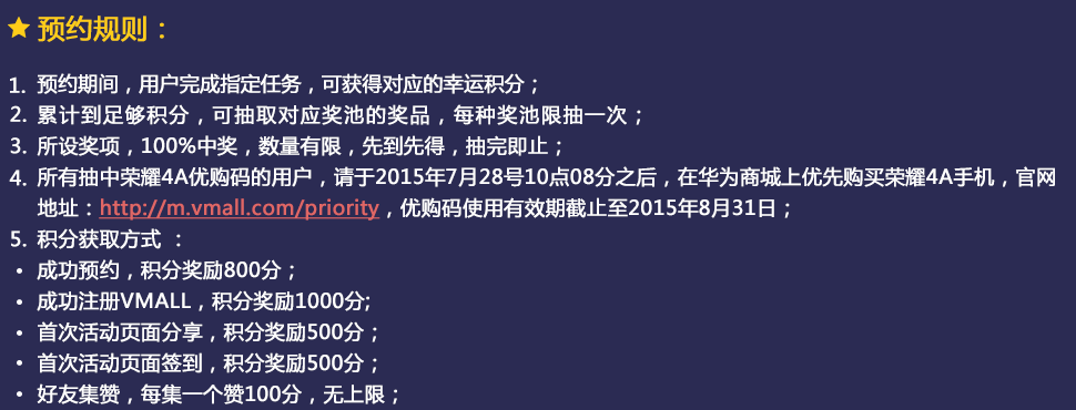 华为荣耀4A在QQ空间首发所举办的预约有奖活动,用户在活动期间完成指定任务,即可获得幸运积分,累积积分即可参与抽奖,100%有奖哦!