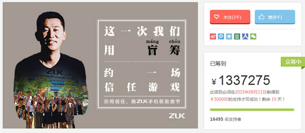 另外,该机还另辟蹊径与京东商城合作进行众筹,名为“盲筹”的模式,共分为1元、99元、299元、9999元四个档位,众筹成功后各个档位都会换来不同的奖励机制,包括获得优购码、移动电源、ZUK Z1手机等。