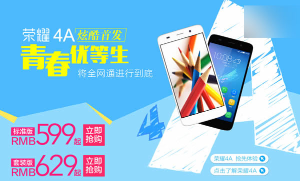 为荣耀家族的新小弟——荣耀4A,主打低价格 全网通,机身造型和4C相似,但触摸键被换成了虚拟键,侧面金属薄镀边框 内凹弧形设计,单手持握感良好。而7月28日,也就是今天10点08分,华为荣耀4A首发上市,该机有全网通版、移动版和电信版3个版本,价格分别为699元、599元和699元。