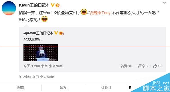 今天,小米市场负责人@魏来Tony在微博上透露:“816,北京见!”,暗示小米8月16日将在北京举办新品发布会。IHS Technology中国研究总监王阳则转发该微博调侃称:“掐指一算,红米note2该登场亮相了。”