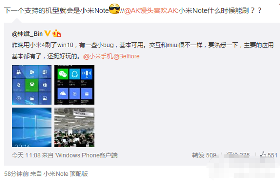 林斌表示,昨晚用小米4刷了Win10,有一些小bug,基本可用。交互和MIUI很不一样,要熟悉一下,主要的应用基本都有了,还挺好玩。此前,小米社区已经开启小米4 Windows 10系统的内测,即将开放下载ROM。