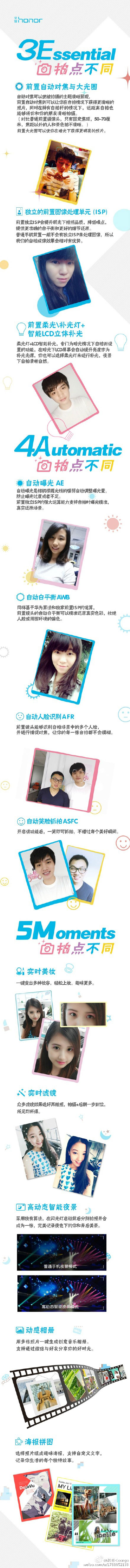 其中3E包括前置自动对焦大光圈、独立的前置图像处理单元(ISP)、前置柔光/补光灯+智能LCD立体补光;4A包括自动曝光AE、自动白平衡AWB、自动人脸识别AFR、自动笑脸抓拍ASFC;5M包括实时美妆、实时滤镜、高动态智能夜景、动感相册、海报拼图。