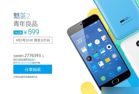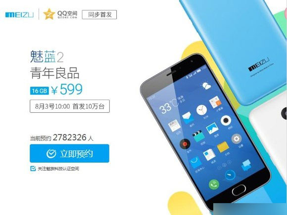 此次魅蓝2在QQ空间首发预约,而且将会在8月3日上午10:00准时开售,想要获得这款手机的用户现在就开始预约吧!