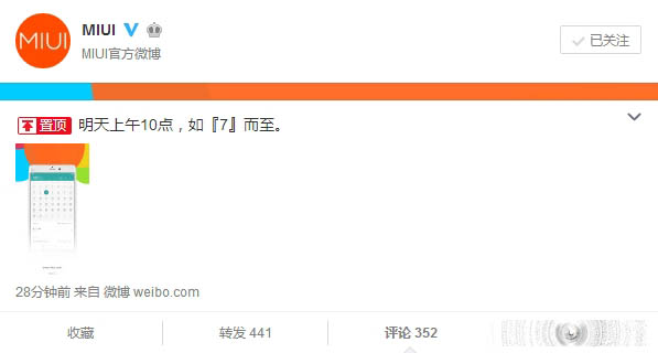 没想到的是,短短几个小时之后,小米官方就开始暗示MIUI 7了。昨天晚上,@MIUI官方微博发言称,明天上午10点,如『7』而至。
