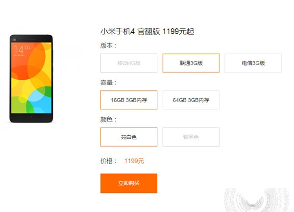 而小米4官翻版目前只有联通3G和移动3G版可选,均配备3GB内存,16GB版售价1199元,64GB版售价1499元。