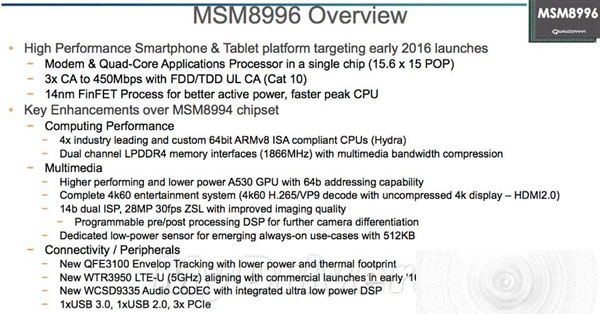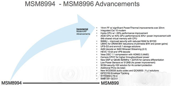 骁龙810让高通蒙受了前所未有的耻辱,业内也传出一片让高通拆分芯片部门“送给”Intel的声音。已经发生的无法挽回(当然死不承认也不是好事儿),只能期待未来新品重塑形象了,这就是下一代旗舰骁龙820 MSM8996。