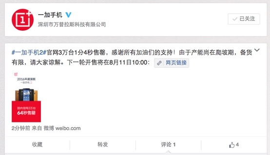 一加手机在时隔461天后终于发布了一加手机2,不错的外观设计以及质感、指纹识别功能、顶级的硬件配置等都是该机突出的亮点。而8月4日上午10点,一加手机2在官网上开启现货发售,开售仅1分4秒后一加官网上的3万台手机便宣布售罄。