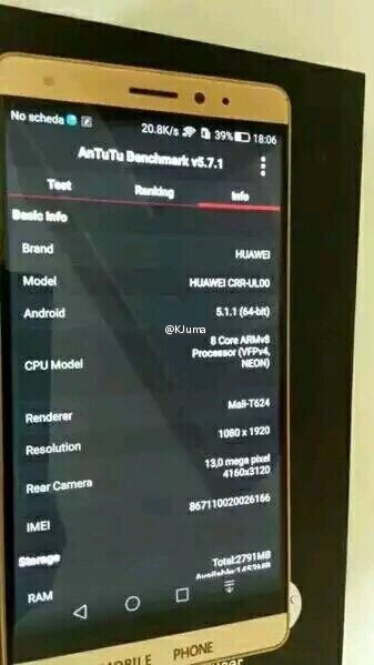据称,Mate 7 mini是华为上海研究所出品的,产品编号为CRR-UL00,金属一体注塑机身,5.7寸1080p屏幕,只比Mate 7老大哥小了0.3英寸——没错,5.7寸都是迷你版了!配置方面,它采用了麒麟935处理器,八核A53,整合GPU Mali-T624MP4(华为的说法是T628),同时搭配3GB内存、1300万像素索尼IMX 278传感器摄像头。从截图上看,该机已经有了IMEI编号,说明已经彻底完工了。