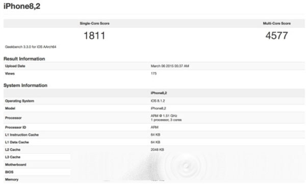 昨天不知道从哪流传了一张所谓iPhone 6S的配置谍照,依然是1GB内存,搭载的是2GHz主频A9处理器,如此奇葩的搭配,再次引来用户的吐槽。现在可以肯定的说,这个配置图必然是假的,因为iPhone 6S(代号iPhone8,2)已经出现在Geekbench上了,而它的参数也有了答案。