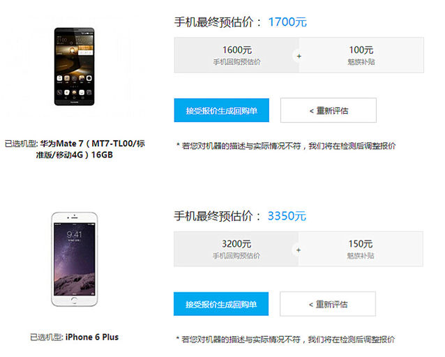 随后笔者拿另外两个品牌的手机做了测试,分别是标准版华为Mate 7,回收价1700元;16GB版本的iPhone 6 plus,回收价仅3350元。看来魅族对于除了小米之外的其他品牌的手机回收价格远远低于市场回收价,比一般用户的预期低很多。只有小米手机,在魅族这里能获得相对不错的回收价,难道这还不算真爱吗?