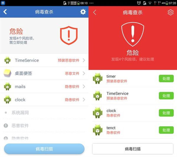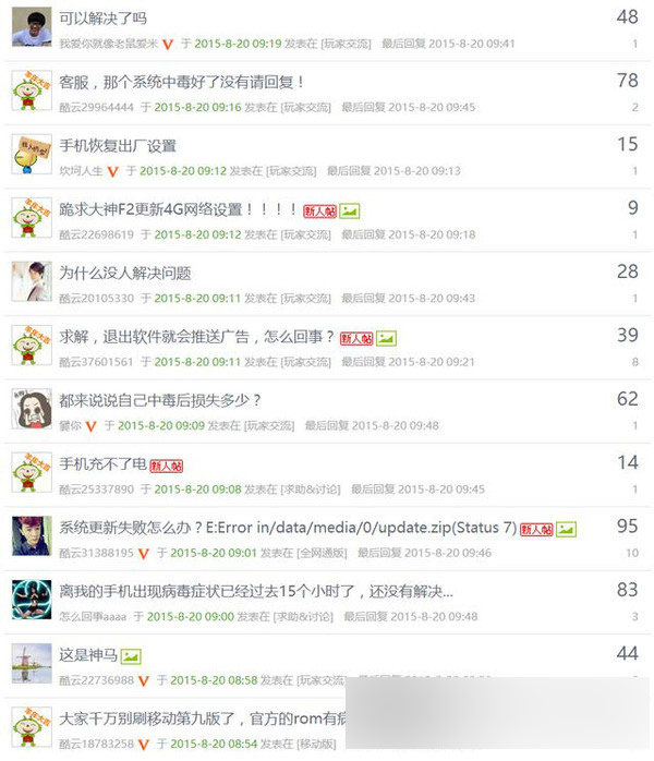从酷派大神官方论坛可以看到,很多用户都在反映系统更新后存在病毒,使用安全软件检测到存在四个病毒,包括MokeyTest、TimeService、升级与Timer程序。