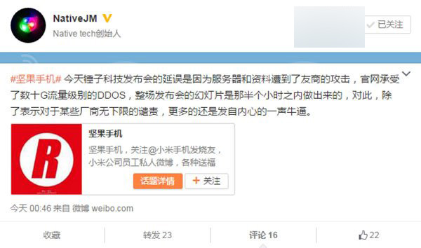 据Native tech创始人@NativeJM介绍,“今天锤子科技发布会的延误是因为服务器和资料遭到了攻击,官网承受了数十G流量级别的DDOS,整场发布会的幻灯片是那半个小时之内做出来的。”