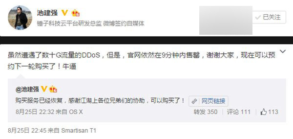 对此,锤子科技云平台研发总监@池建强也表示官网“遭遇了数十G流量的DDoS”,同时透漏了官网发售的坚果手机9分钟内已全部售罄。