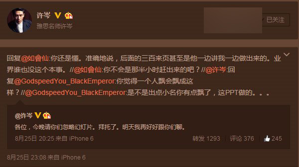 发布会幻灯片制作人@许岑则在微博表示“请忽略幻灯片”,并称“后面的三百来页甚至是他一边讲我一边做出来的。”至于为何临时现做的原因,他并没有明说,不过结合锤子科技内部人士以及网友的说法,整个事件也基本可以理清了。