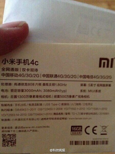 日前,有网友曝光了小米4c的包装盒和真机照片。照片中的信息显示,小米4c将采用5英寸显示屏(分辨率应该是1080P);搭载1.8GHz骁龙808六核处理器,2GB RAM,运行最新MIUI7系统;配500万+1300万像素摄像头;电池容量3000mAh;支持双卡双待全网通。