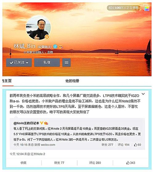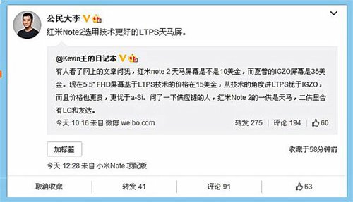 (1)小米联合创始人、总裁林斌在微博上表示:“前两年我负责小米的高层战略合作,和几个屏幕厂商交流很多,LTPS技术确实优于IGZO和a-si,价格也更贵。