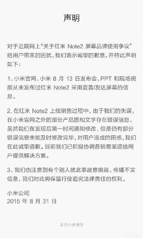 有消费者拿到红米Note 2后发现黄屏现象严重,甚至已经超出了可接受程度。之后,网友通过手机评测发现,红米Note 2采用的国产天马屏幕,而非在某些渠道(京东、国美等)宣传的夏普/友达,并以此质疑小米“换屏”。