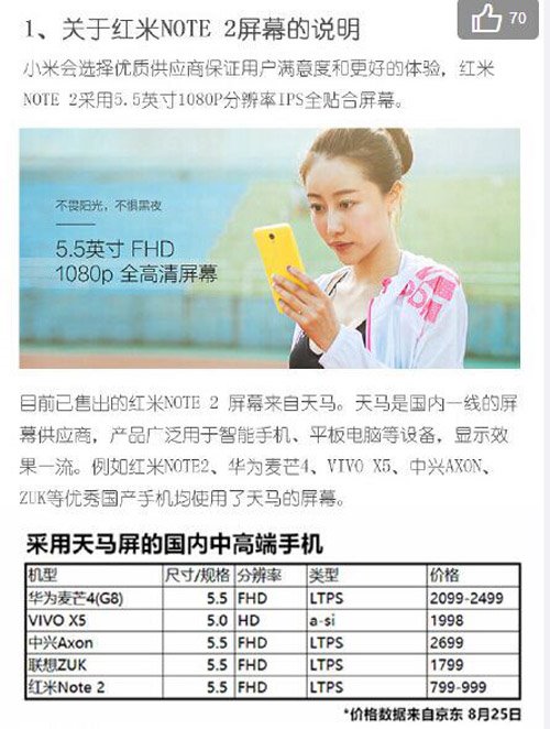 (3)前几天,小米还采取了拉其他厂商一起下水的方式,指出不仅是小米,其他厂商手机甚至旗舰手机都在用天马屏,包括华为的麦芒4、Vivo的X5、中兴的Axon旗舰机、联想的ZUK Z1等。
