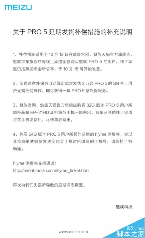 魅族表示,该补偿措施适用于10月12日在魅族官网、魅族天猫官方旗舰店、魅族京东旗舰店等线上渠道全款购买魅族PRO 5的用户。线下渠道仍按照发布会所公布,于10月18日开始发售。