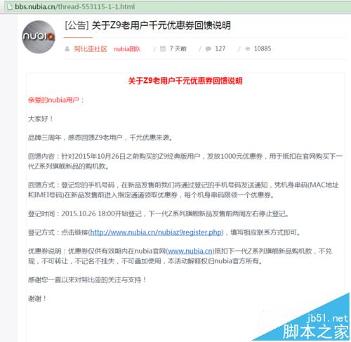 nubia品牌成立三周年,感恩回馈Z9老用户,针对2015年10月26日之前购买的Z9经典版用户,发放1000元优惠券,用于抵扣在nubia官网购买下一代Z系列旗舰新品的购机款。
