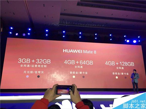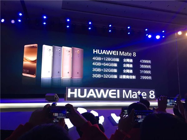 Mate8售价2999元起。3GB+32GB 运营商定制版2999元;3GB+32GB 全网通3199元;4GB+64GB 全网通3699元;4GB+128GB 全网通 4399元。