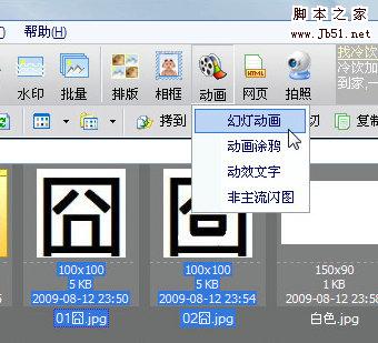 4.选中图01和02,动画----幻灯动画,间隔为2,动画大小调整为100*100,保存。“囧囧”有神的QQ表情就完成啦,是不是很简单呢o(∩_∩)o