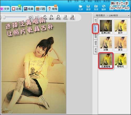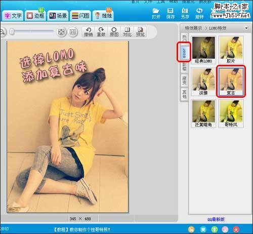步骤二:打开“图片处理”,会看到有很多风格的照片风格,在“LOMO”里选择“复古”风格。