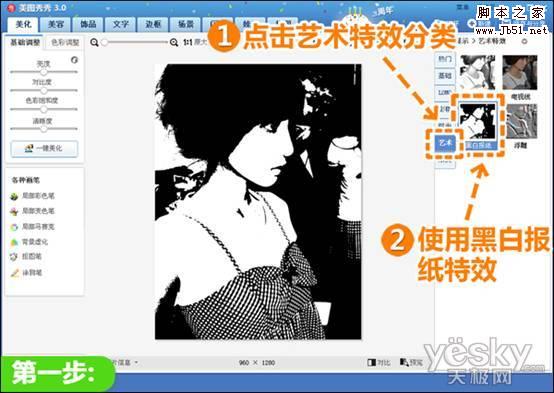 1、在软件下打开待处理照片,点击“艺术”特效分类,使用“黑白报纸”特效。