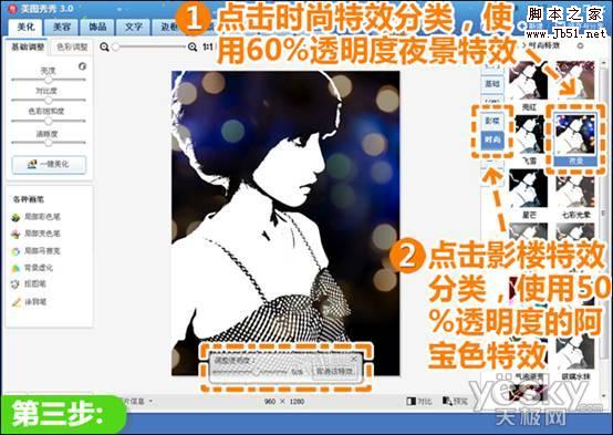 3、点击“时尚”特效分类,使用透明度为60%的“夜景”特效;再点击“影楼”特效分类,使用50%透明度的“阿宝色”特效。
