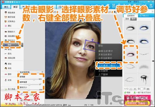 2.选择“眼影”,在右侧素材展示栏中选择眼影素材,调节好大小透明度和角度,然后鼠标右键选择正片叠底,使眼睛瞬间电力十足。