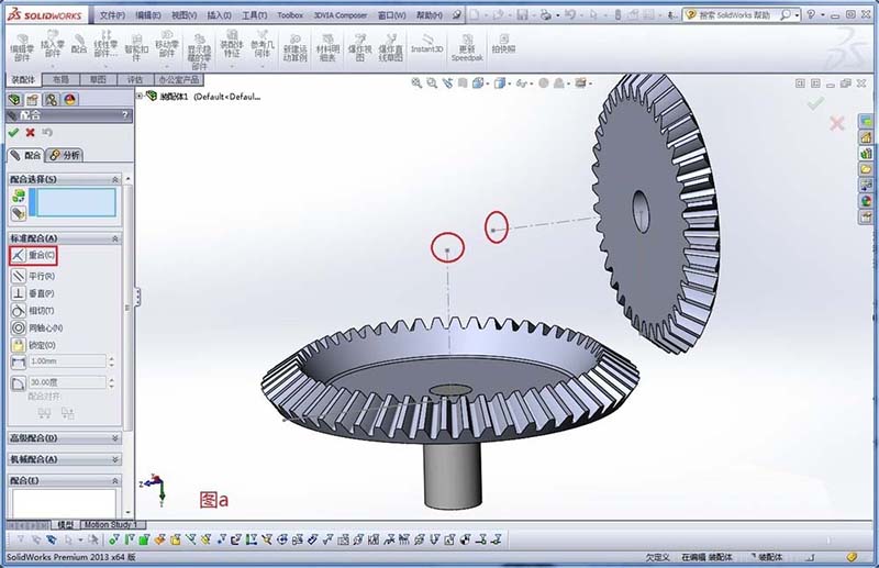 5、如下图a所示:选择标准配合里面的“重合”,分别找到两齿轮零件中之前画的“基准面”,把它们作为要配合的实体,配合好后,可以看见两个齿轮之间不存在干涉,如下图b所示: