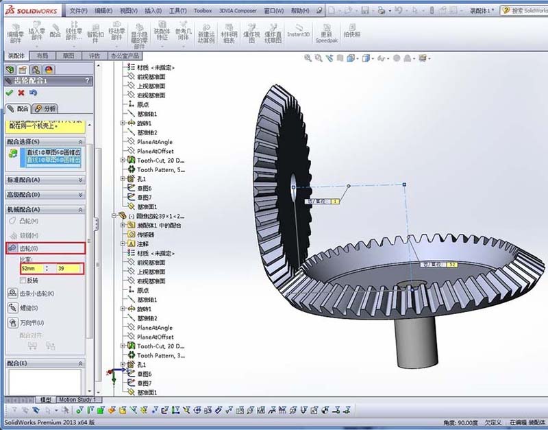 7、选择机械配合里面的“齿轮”,先后点击大小齿轮的轴线作为要配合的实体,在比例栏分别输入大小齿轮的齿数。注意先选大齿轮轴线则左边输入大齿轮齿数,这样正确对应。如下图所示: