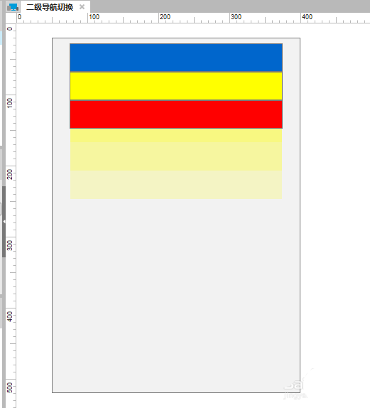 1、首先大家通过Axure的部件--矩形,建立如图所示的图样。(基础的我就不太细说了),底色图:灰色,w350/h500;三个彩色的矩形:w300/h40;分别命名为1,2,3,无色的三个矩形:w300/h100;分别对应彩色的命名11,22,33,调整一个彩色的矩形对应一个白色的矩形,排版如图所示;
