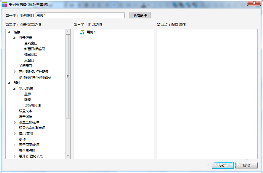 1、选择蓝色的矩形(也就是1);在“部件交互和注释”-“鼠标单击时”,右键“新增用例”;弹出用例编辑器