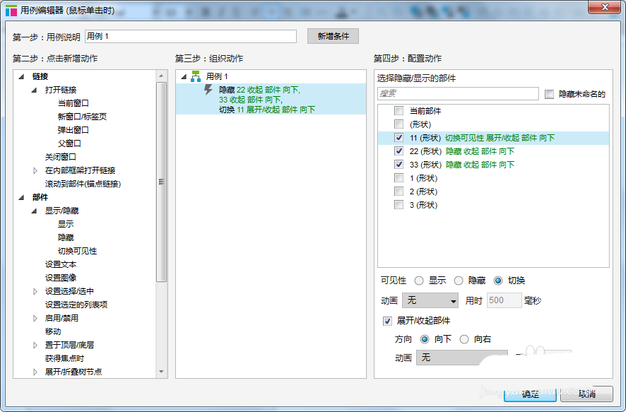 2、在用例编辑器,选择"部件“-切换;在最右侧“第四步 配置动作”,选中"11",可见性选择“切换”,并在”更多选项“中选择”展开部件“;选择“22”,可见性选择“隐藏”,选中“收起部件”,其他默认;