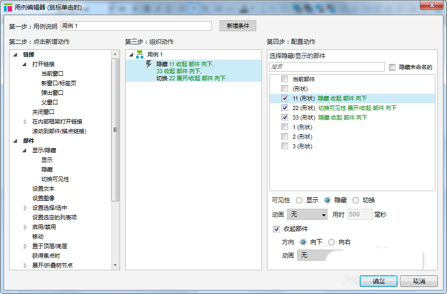4、选择红色矩形3,在“部件交互和注释”-“鼠标单击时”,右键“新增用例”;弹出用例编辑器;在用例编辑器,选择"部件“-切换;在最右侧“第四步 配置动作”,选中"33",可见性选择“切换”,并在”更多选项“中选择”展开部件“;选择“11”,可见性选择“隐藏”,选中“收起部件”,其他默认;选择“22”,可见性选择“隐藏”,选中“收起部件”,其他默认;点击确认,设置完成后,如图所示