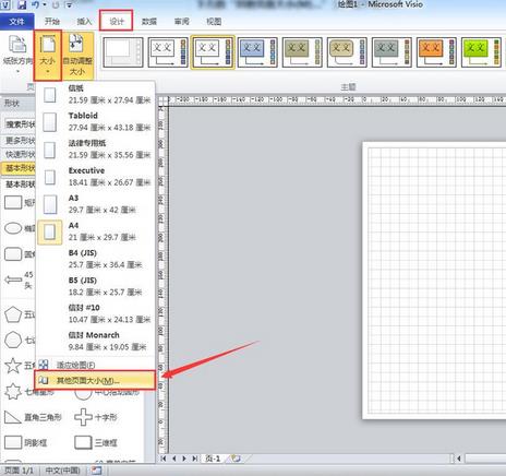 2、如果需要更改页面尺寸,鼠标左键依次点击菜单栏 设计 → 页面设置工具框右下角的扩展按钮(或者点击页面设置工具框的“大小”下拉菜单,然后点击下拉菜单最下方的“其他页面大小(M)…”)。如下图所示: