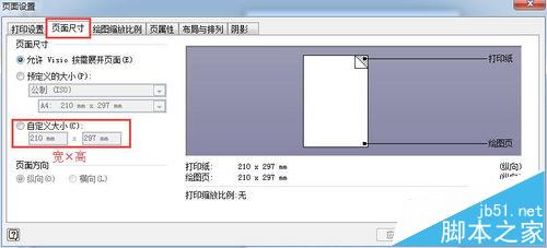 3、在弹出的页面设置对话框的页面设置面板,选中“自定义大小”,并输入你需要的尺寸。如下图所示: